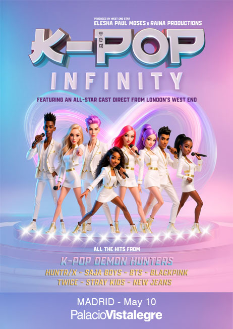 K-POP INFINITY — El futuro del K-pop ya ha comenzado ¡Ha llegado una nueva era del entretenimiento en vivo! K-POP INFINITY es una experiencia escénica explosiva, eléctrica y visionaria. El público podrá disfrutar de los éxitos de la exitosa película de animación K-Pop Demon Hunters de Huntr/x y Saja Boys, así como de canciones icónicas de BTS, BLACKPINK, TWICE, NewJeans, Stray Kids y muchas otras de las grandes estrellas del K-pop. El espectáculo combina la energía cinematográfica del universo K-pop con la potencia teatral del West End, con ocho artistas de talla mundial, efectos visuales espectaculares y un paisaje sonoro que hace vibrar toda la sala.